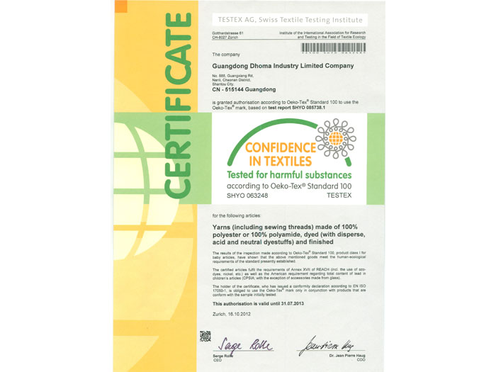 《欧盟认证证书--Oeko-Tex Standard》纱线