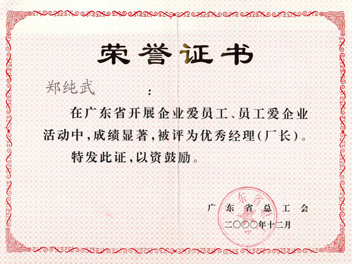 总经理被评为优秀经理证书